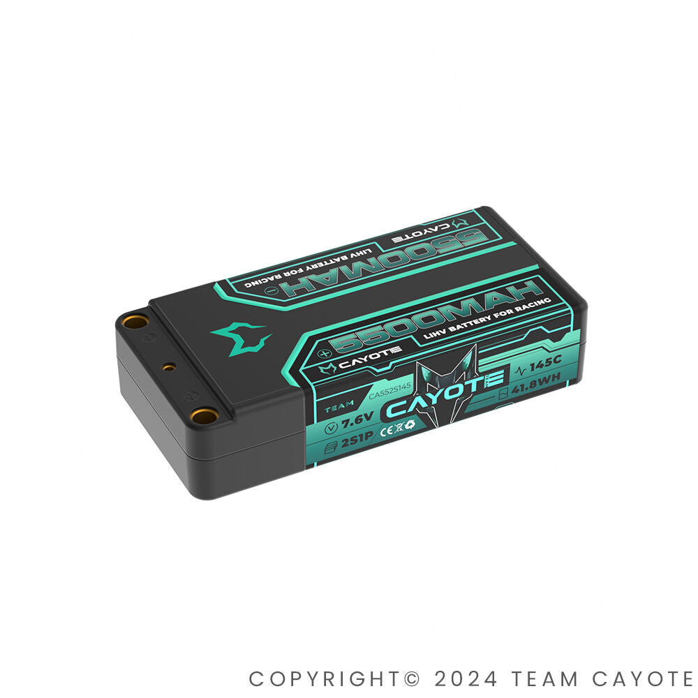 CAYOTE Racing 2S Shorty LiPo battery with a capacity of 5500mAh at 7.6V and 145C.