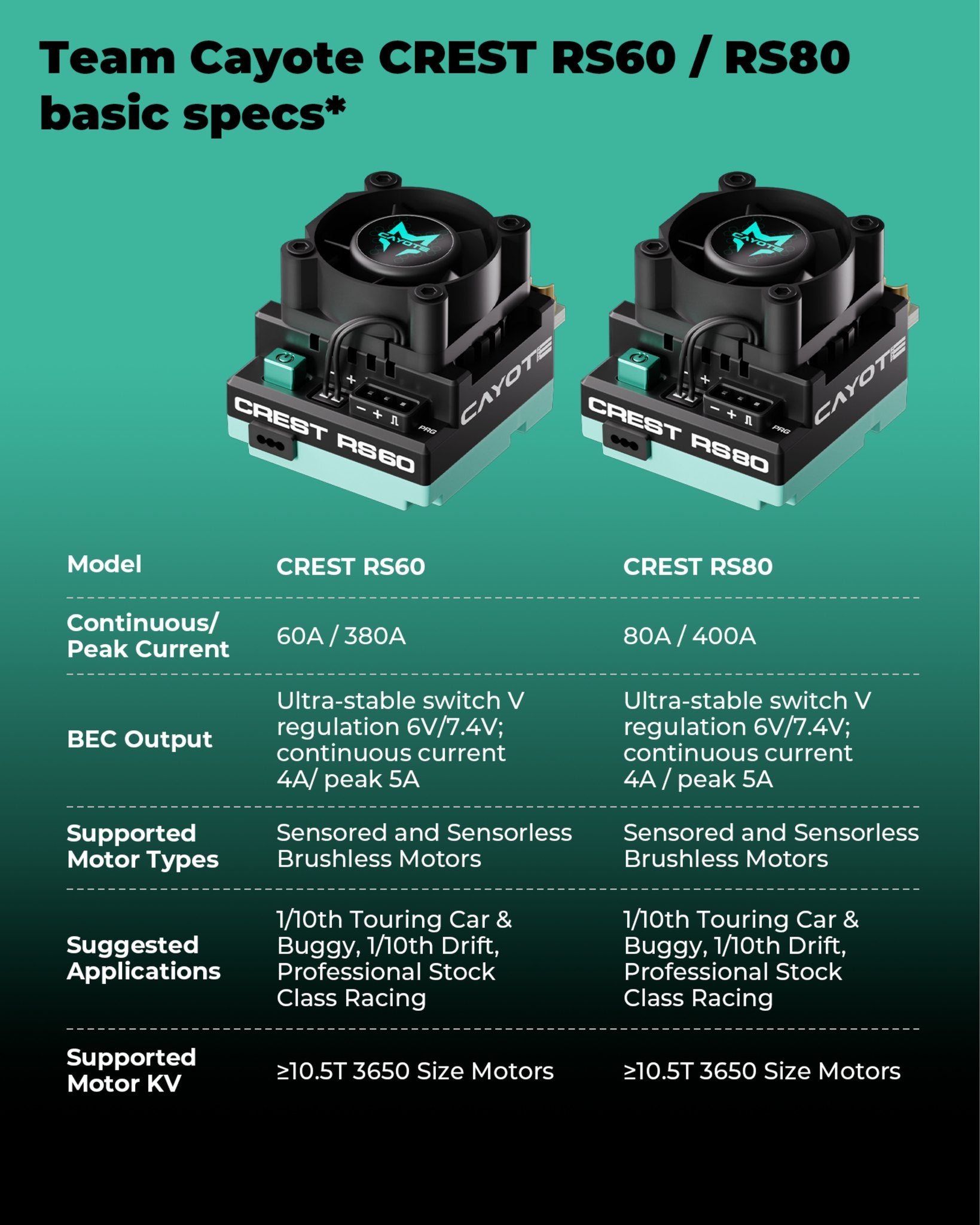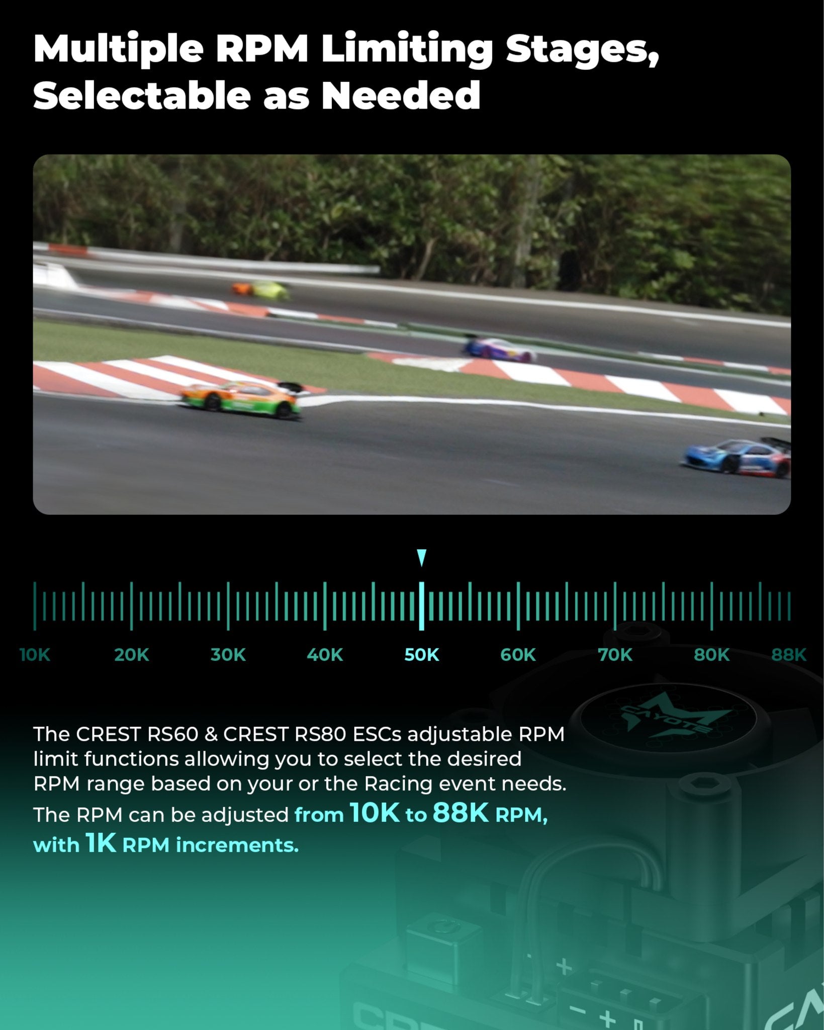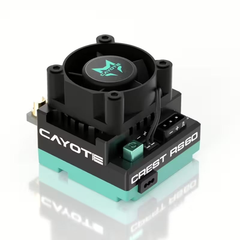 The Cayote CREST RS60 is an electronic speed controller (ESC) designed specifically for use in RC racing and bashing. This model offers advanced technologies that ensure smooth operation and efficient heat dissipation.