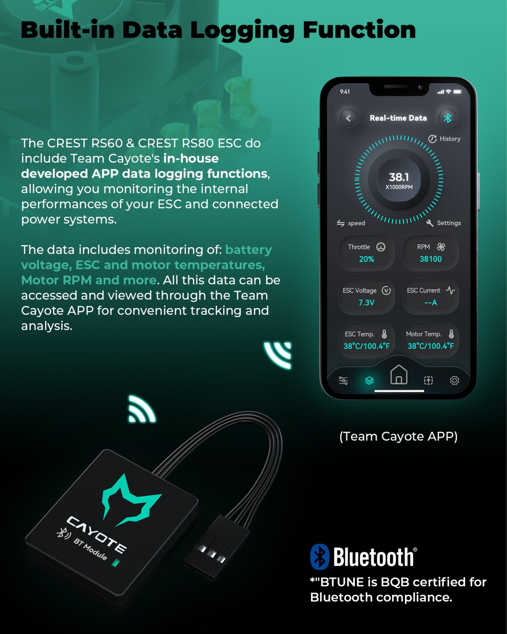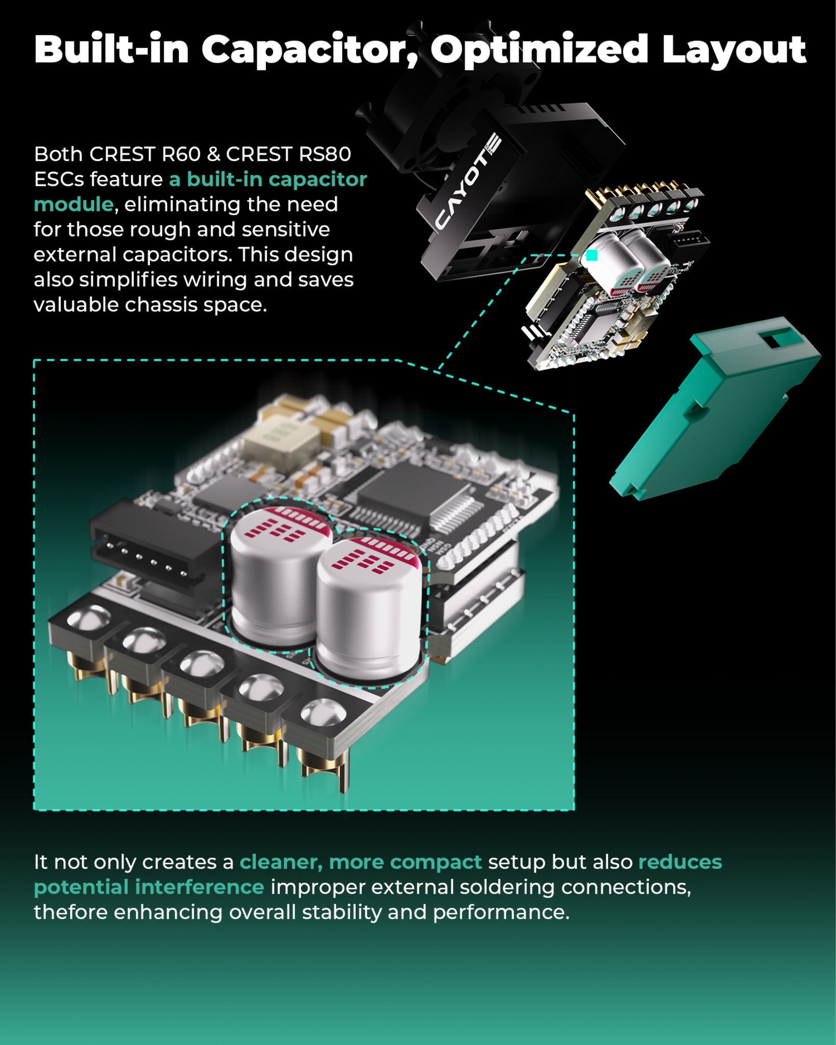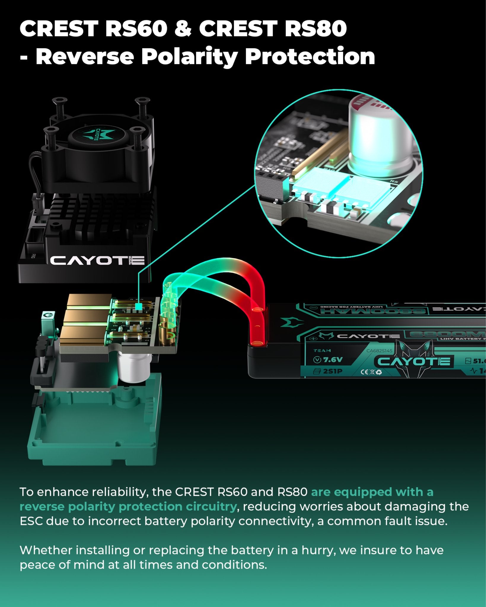The Cayote CREST RS60 is an electronic speed controller (ESC) designed specifically for use in RC racing and bashing. This model offers advanced technologies that ensure smooth operation and efficient heat dissipation.