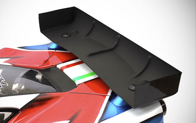 Type S GT Wing designed for use with its GT5 Zonda and GT6 Pista 1:8 GT Onroad bodies. Compared with the original GT5/GT6 wings, the new Type S option provides more rear traction and better top speed, especially on the GT6 Pista body. The standard Type S Wing is made from 1.0mm polycarbonate material with a lightweight option offered in 0.7mm thickness.
