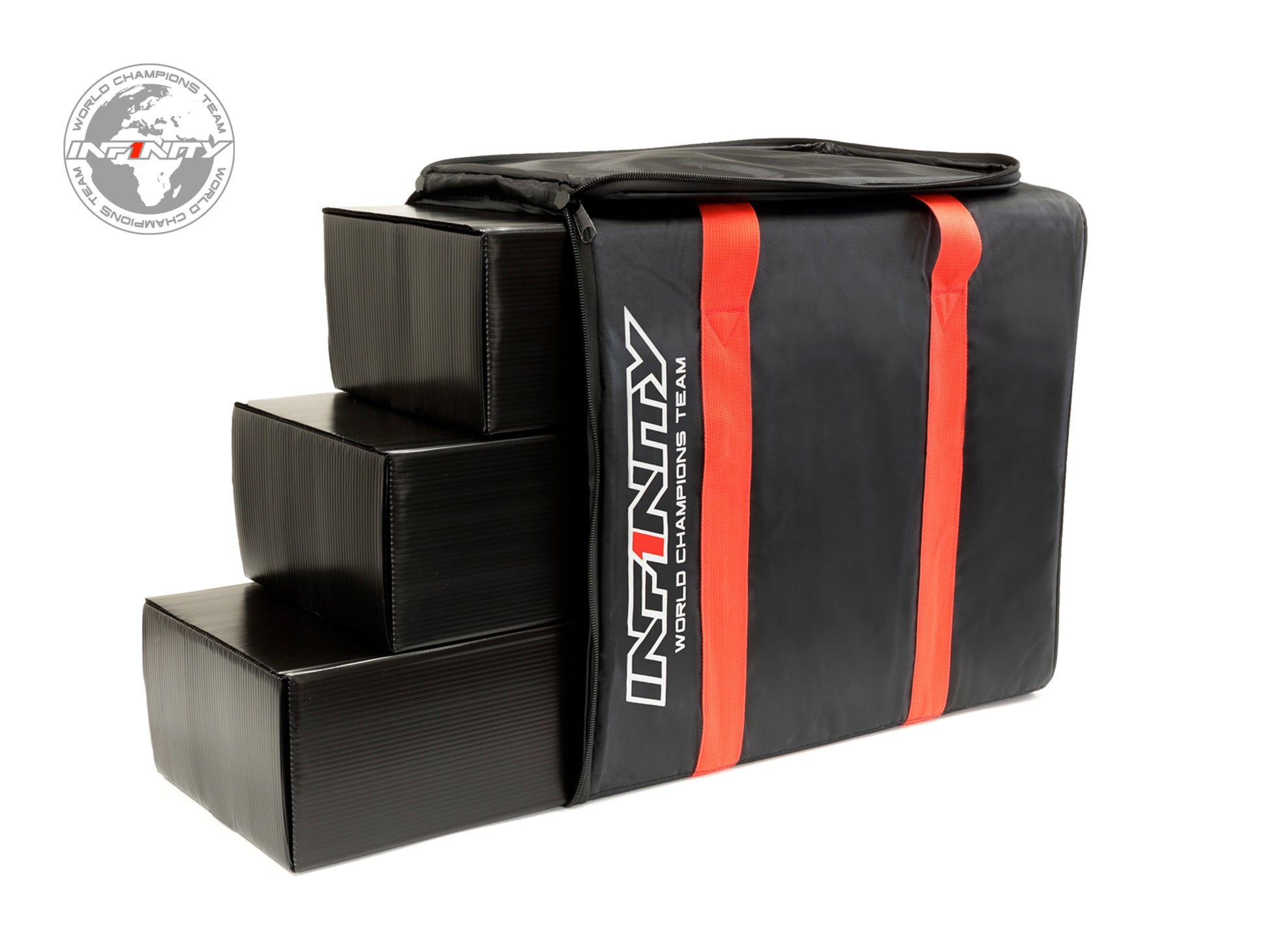 This carrying bag is brightly colored with INFINITY brand colors of black and red.